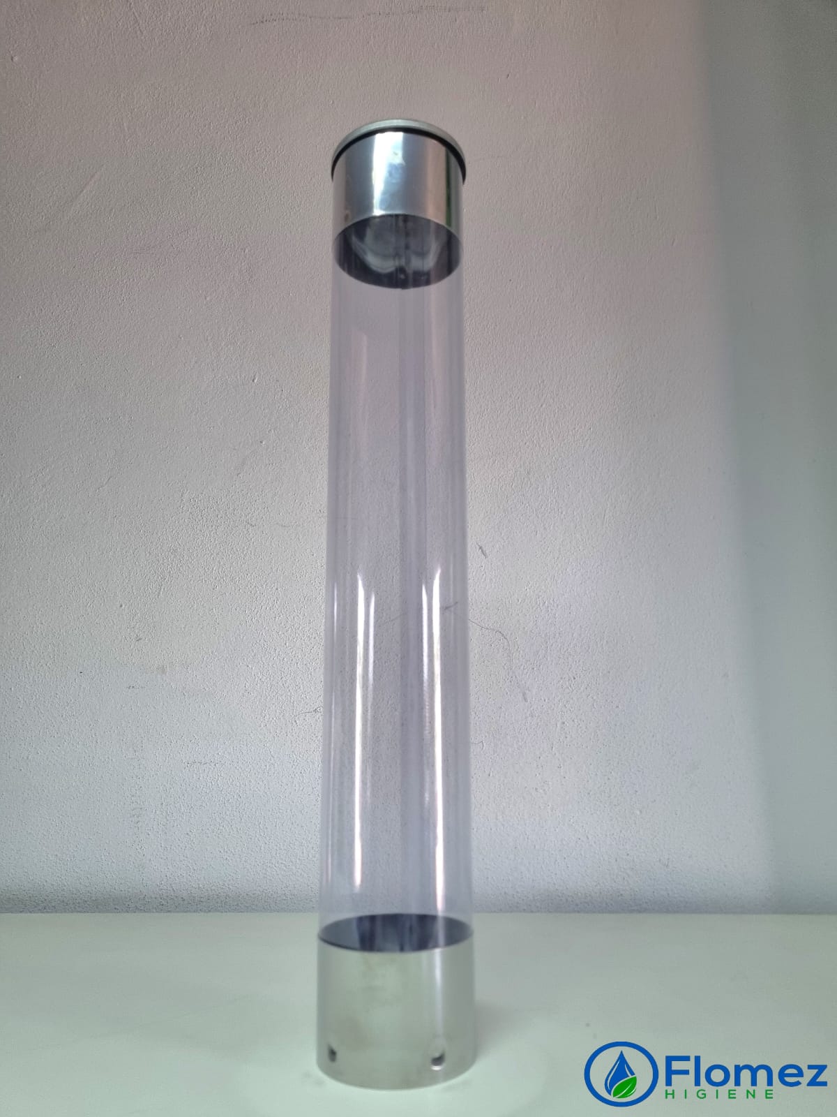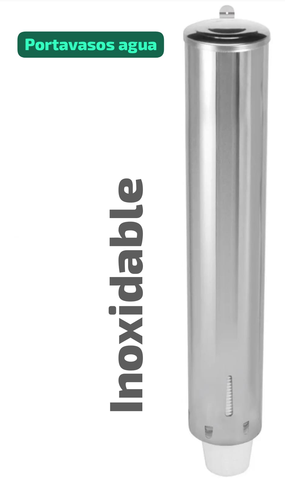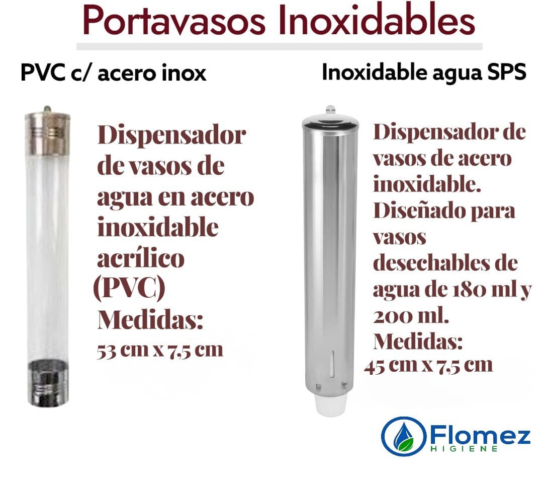 Dispensador de vasos de agua disponible en versiones de acero inoxidable con acrílico o totalmente de acero inoxidable, diseñado para vasos desechables de 180 ml y 200 ml.
